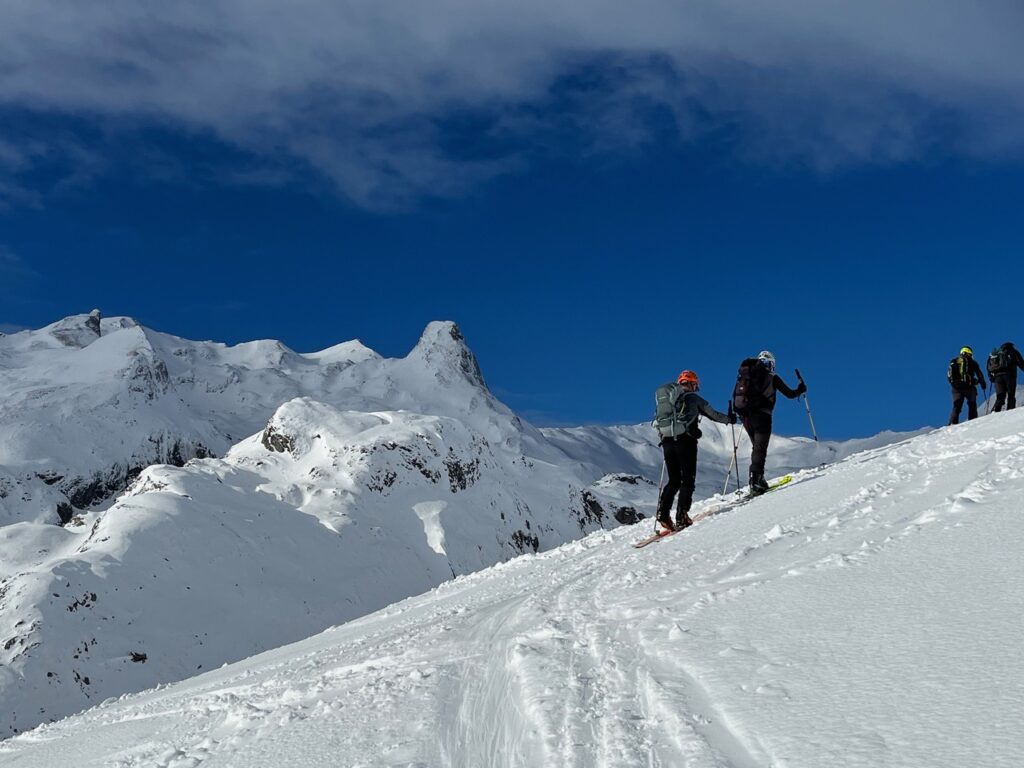Belle journée, bonne neige sur les versants nord, bon petit groupe de cinq. Skis sur le sac pour s'extraire de Read more