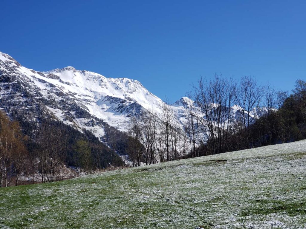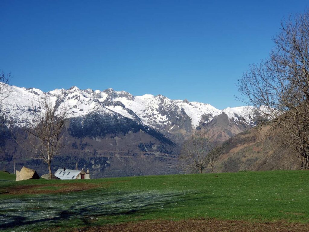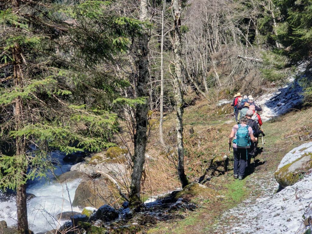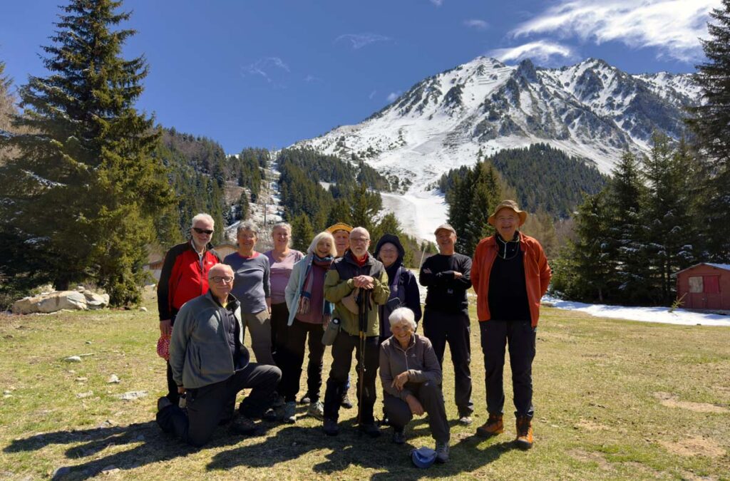 11 randonneurs partirent de Barèges, sous le soleil, mais dans la froidure matinale, pour découvrir des paysages variés, les 2 versants de la vallée du Bastan, par ce printemps dont les verts vifs se parent d’un récent manteau neigeux : depuis les hêtraies du versant Nord, derrière les thermes, vers le plateau de lumière (vue plongeante sur Luz la bien nommée), puis promenade face au Pic du midi par l’allée verte dans la forêt de l’Ayré jusqu’au plateau du Lienz (idéal pour un pic nic) et retour le long du ruisseau de Pourtazous, jusqu’au hameau Rollot, traversée de la d 918 et remontée sur la soulane prairie et granges, par Transarrious, Souriche (source pulsatile),Midaou, et lacets forestiers en surplombant le Bastan et en ignorant le parcours d’exercices de dessin ! L’effort fut plus modeste que prévu (nous avons décliné le supplément vers la chapelle du camp Rollot) déniv cumulé 520m, pour 12 km , mais nous avons utilisé nos forces pour réviser nos réflexes de mise en sécurité, notre intelligence collective et notre solidarité. Merci à chacun et chacune pour vos contributions, sans oublier de citer le réconfort du fameux pain d’épices ! Qui saura nous expliquer la magie des nuages irisés en forme de parachutes ? Francine