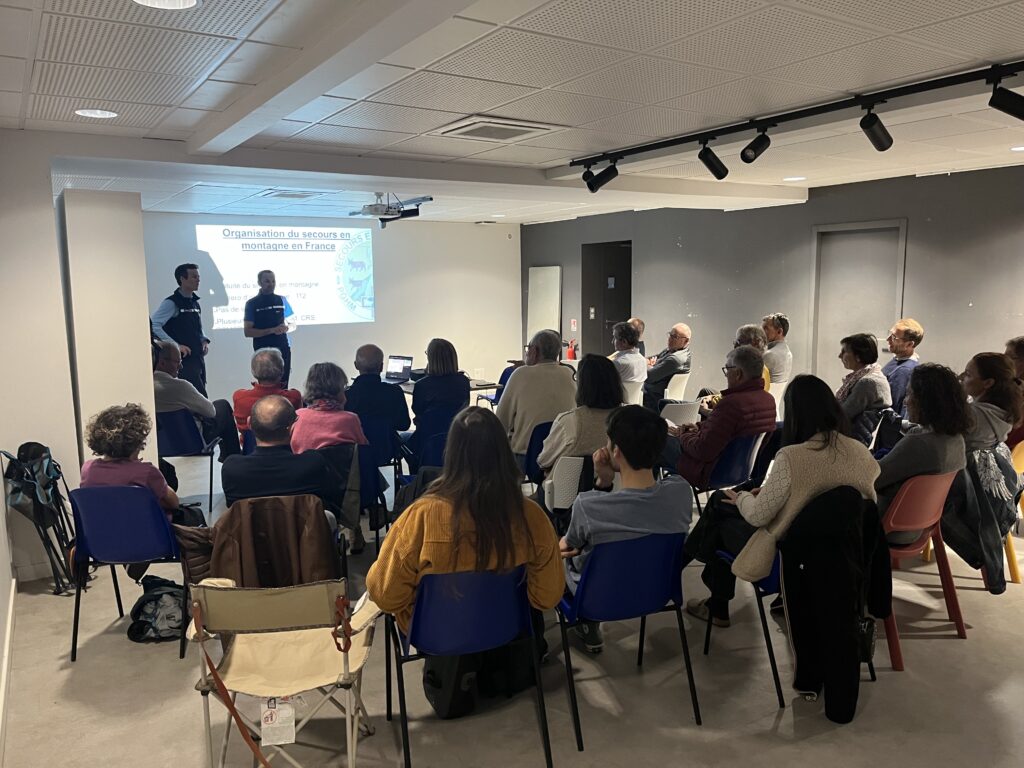 C’était il y a une semaine! Deux intervenant du PGHM ont proposé une soirée fort instructive aux skieurs de rando chanceux. Comment s’organisent les secours, comment se répartissent ils en fonction des départements. Nous avons parlé aussi de responsabilités, de préparation et de gestions des sorties. Rappelé l’importance et l’intérêt d’être formé pour encadrer, mais aussi la formation de tous. Le timing des secours, les formations aux premiers secours qui permettent de prendre en charge d’éventuels blessés avant leur arrivée. Mais aussi d’informer correctement les régulateurs. Il nous a été ré-dit qu’il ne faut pas hésiter à les appeler pour affiner la préparation et connaître les conditions d’un secteur. Les accès. Et qu’il ne faut pas hésiter à les appeler si l’on se trouve en difficulté! Merci encore aux deux intervenants du jour.