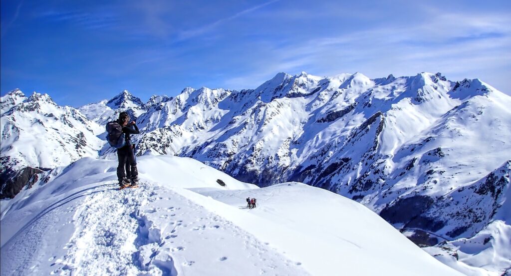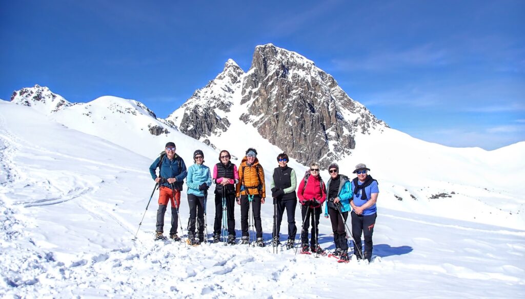 Avec enfin le beau temps revenu, c’était le jour de profiter de la neige et du soleil, Elvira nous a proposé une sortie raquettes en vallée d’Ossau, et visiblement pas mal de monde avait eu la même envie. Entre Anéou et le secteur de Pombie une importante délégation de Pyrénéa, (un bon groupe de skieurs de rando et 3 des différents niveaux de randonneurs) avait choisi de profiter des beaux paysages enneigés. En compagnie de nos amis du niveau 2, nous sommes partis du caillou de Soques , raquettes aux pieds , pour traverser la forêt menant au vallon de Pombie. Après les cabanes nos parcours ont divergé, le refuge de Pombie pour le N2, et nous le N1 avons bifurqué plein sud pour gravir les pentes menant au Soum de Pombie. Sur une neige superbe, gelée par endroit et le plus souvent en fine épaisseur de poudreuse mais toujours bien porteuse sous les raquettes, nous avons louvoyé sur les belles pentes douces puis en suivant la crête nous sommes arrivés au Soum de Pombie. Au sommet, le magnifique paysage à vite fait oublier le poids des raquettes et les jambes lourdes de la montée, la récompense des efforts était là, superbe, grandiose devant les yeux : Au sud l’immense terrain de jeu du cirque d’Anéou et de l’Espagne, à l’Est le vallon d’Arrious, les Lurien , Palas , Arriel, Soques et bien d’autres pics , au Nord Le Saoubiste , le col de Suzon , et surtout le majestueux et impressionnant pic d’Ossau, quelle vue spectaculaire à 360° et quel bonheur de contempler ces paysages enneigés!. Mais même une belle vue ne remet pas de l’énergie dans le moteur et c’est sur ce beau promontoire, sans un poil de vent, que nous avons fait notre pause pique-nique, comme toujours conviviale, savoureuse et gourmande. Un dernier coup d’œil au paysage, puis nous avons pris la descente en suivant la trace du matin sur une neige à peine transformée sur tout le long du parcours. La dernière petite remontée, assassine, vers le parking tirait quand même sur les mollets, mais les belles images et bons moments de la journée ont vite fait oublier tous les efforts pour aller les admirer. .Elvira, Paul