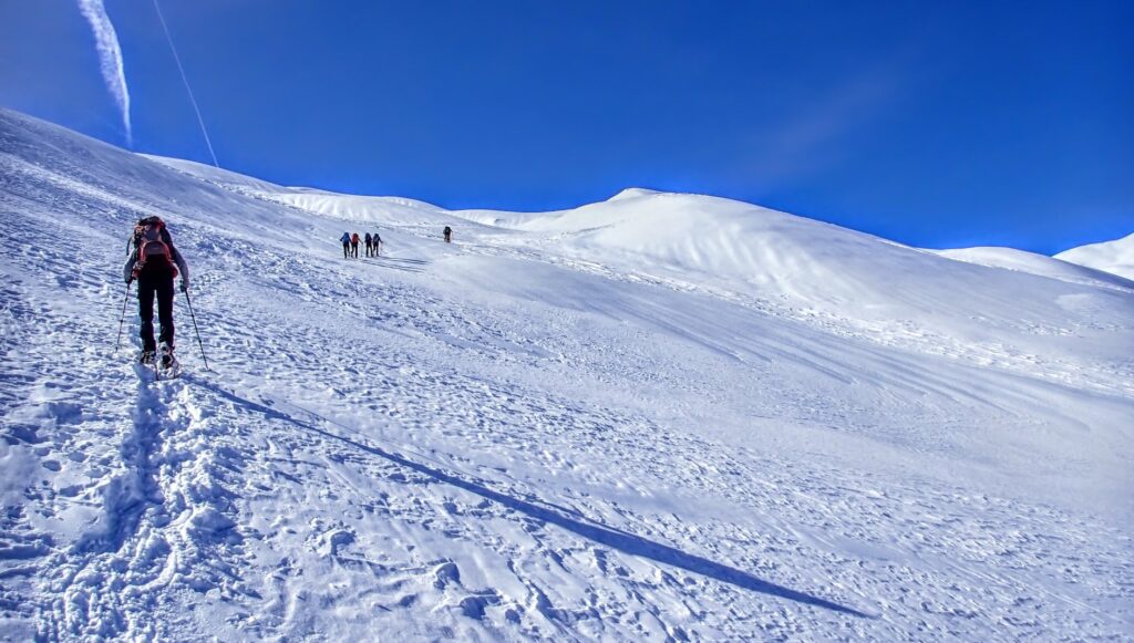 Avec enfin le beau temps revenu, c’était le jour de profiter de la neige et du soleil, Elvira nous a proposé une sortie raquettes en vallée d’Ossau, et visiblement pas mal de monde avait eu la même envie. Entre Anéou et le secteur de Pombie une importante délégation de Pyrénéa, (un bon groupe de skieurs de rando et 3 des différents niveaux de randonneurs) avait choisi de profiter des beaux paysages enneigés. En compagnie de nos amis du niveau 2, nous sommes partis du caillou de Soques , raquettes aux pieds , pour traverser la forêt menant au vallon de Pombie. Après les cabanes nos parcours ont divergé, le refuge de Pombie pour le N2, et nous le N1 avons bifurqué plein sud pour gravir les pentes menant au Soum de Pombie. Sur une neige superbe, gelée par endroit et le plus souvent en fine épaisseur de poudreuse mais toujours bien porteuse sous les raquettes, nous avons louvoyé sur les belles pentes douces puis en suivant la crête nous sommes arrivés au Soum de Pombie. Au sommet, le magnifique paysage à vite fait oublier le poids des raquettes et les jambes lourdes de la montée, la récompense des efforts était là, superbe, grandiose devant les yeux : Au sud l’immense terrain de jeu du cirque d’Anéou et de l’Espagne, à l’Est le vallon d’Arrious, les Lurien , Palas , Arriel, Soques et bien d’autres pics , au Nord Le Saoubiste , le col de Suzon , et surtout le majestueux et impressionnant pic d’Ossau, quelle vue spectaculaire à 360° et quel bonheur de contempler ces paysages enneigés!. Mais même une belle vue ne remet pas de l’énergie dans le moteur et c’est sur ce beau promontoire, sans un poil de vent, que nous avons fait notre pause pique-nique, comme toujours conviviale, savoureuse et gourmande. Un dernier coup d’œil au paysage, puis nous avons pris la descente en suivant la trace du matin sur une neige à peine transformée sur tout le long du parcours. La dernière petite remontée, assassine, vers le parking tirait quand même sur les mollets, mais les belles images et bons moments de la journée ont vite fait oublier tous les efforts pour aller les admirer. .Elvira, Paul