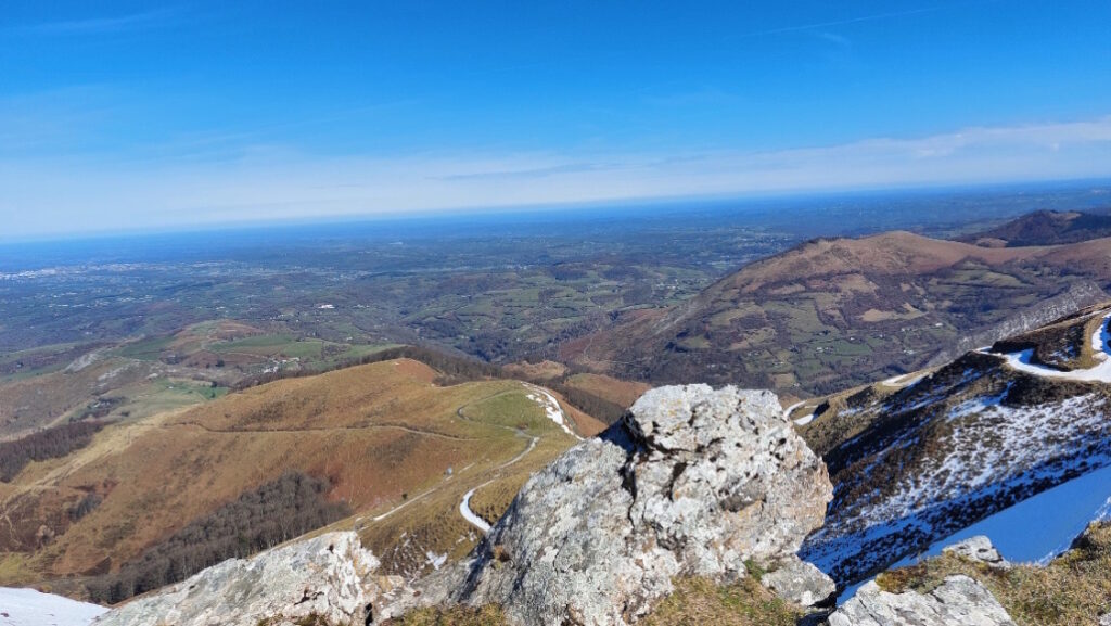 Après les conditions météo déplorables des derniers jours, il fallait profiter de cette fenêtre météo favorable pour aller se dégourdir les jambes, avant l’arrivée d’une autre dépression. Nous étions 9 au départ d’Auchan avec pour objectif un itinéraire inédit découvert en feuilletant les pages du web. Nous partons de Gazost (770m), petit village de 130 habitants situé à l’Est du Gave de Pau et des monts du Hautacam et au sud de la rivière de l’Oussère, aux flots tumultueux après tous ces jours de pluies torrentielles. La route ne va pas beaucoup plus loin et nous utilisons un parking tout neuf près du cimetière. On prend la direction sud-est en empruntant une piste bien tracée qui, semble- t- il, ne figure que depuis peu sur les cartes IGN. On peut penser que cette piste « pastorale » a été aménagée pour permettre la liaison avec la cabane du Couret, objectif de notre rando, qui doit être occupée par les bergers en été. Sur une grande partie du parcours le cheminement est donc évident avec une pente moyenne. A partir de 1100 m on suit un sentier plus ou moins bien tracé qui nous conduit à une première cabane sans nom à 1220m. Le sentier repart au-dessus de la cabane et, malgré la neige présente à partir de 1300m, on peut, sans trop de difficulté le suivre jusqu’à la cabane du Couret . Panorama superbe vers les Pyrénées et vers la plaine. Pique nique en se protégeant bien du vent, petite sieste discrète, photo de groupe et on repart vers Gazost par les crêtes : Plat des Lits, Cap det Mount et Pla des Cots. On prend alors la direction sud-ouest et, en empruntant un des sentiers les plus hauts dans la pente, on rejoint directement le parking du cimetière. Auguste